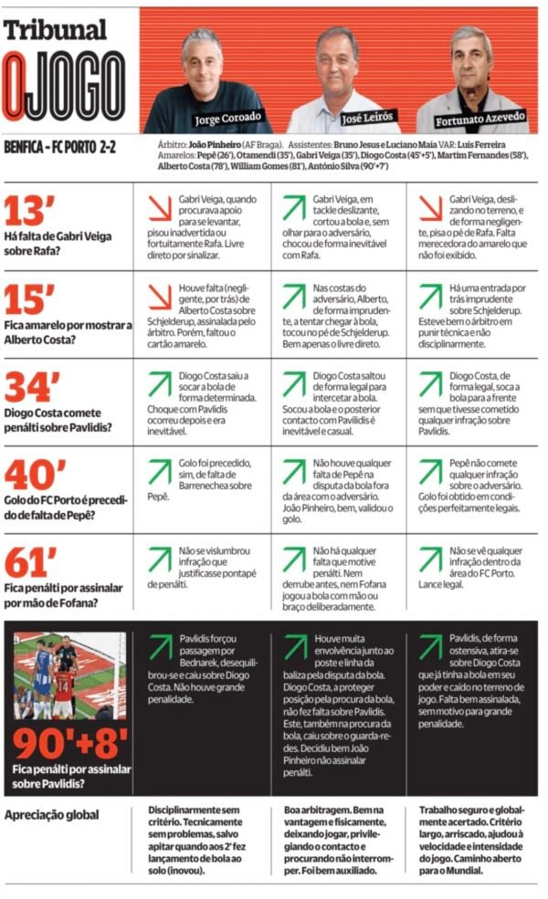 Na análise feita ao jornal O Jogo, o antigo árbitro Jorge Coroado considerou que a decisão do juiz foi acertada, defendendo que não existiu qualquer infração sobre o avançado do Benfica.