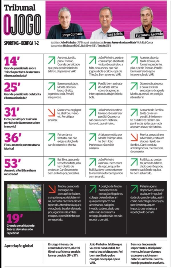 .Para Jorge Coroado, analista do jornal O Jogo, a grande penalidade deveria ter sido repetida uma vez que houve invasão à área por parte dos jogadores do Benfica.